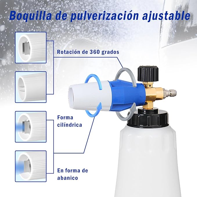 - Montaje universal: Nuestros lanzadores de cañones de espuma vienen con un acoplamiento rápido de 1/4" que se adapta a la mayoría de las pistolas de limpieza de alta presión. Además, nuestros productos vienen con una boquilla de 1,1 mm para pistolas de alta presión con una presión de 80-13 bar, y puede reemplazar la boquilla de 1,25 mm según sea necesario, que se puede usar con pistolas de limpieza de alta presión con una presión de 100-150 bar.