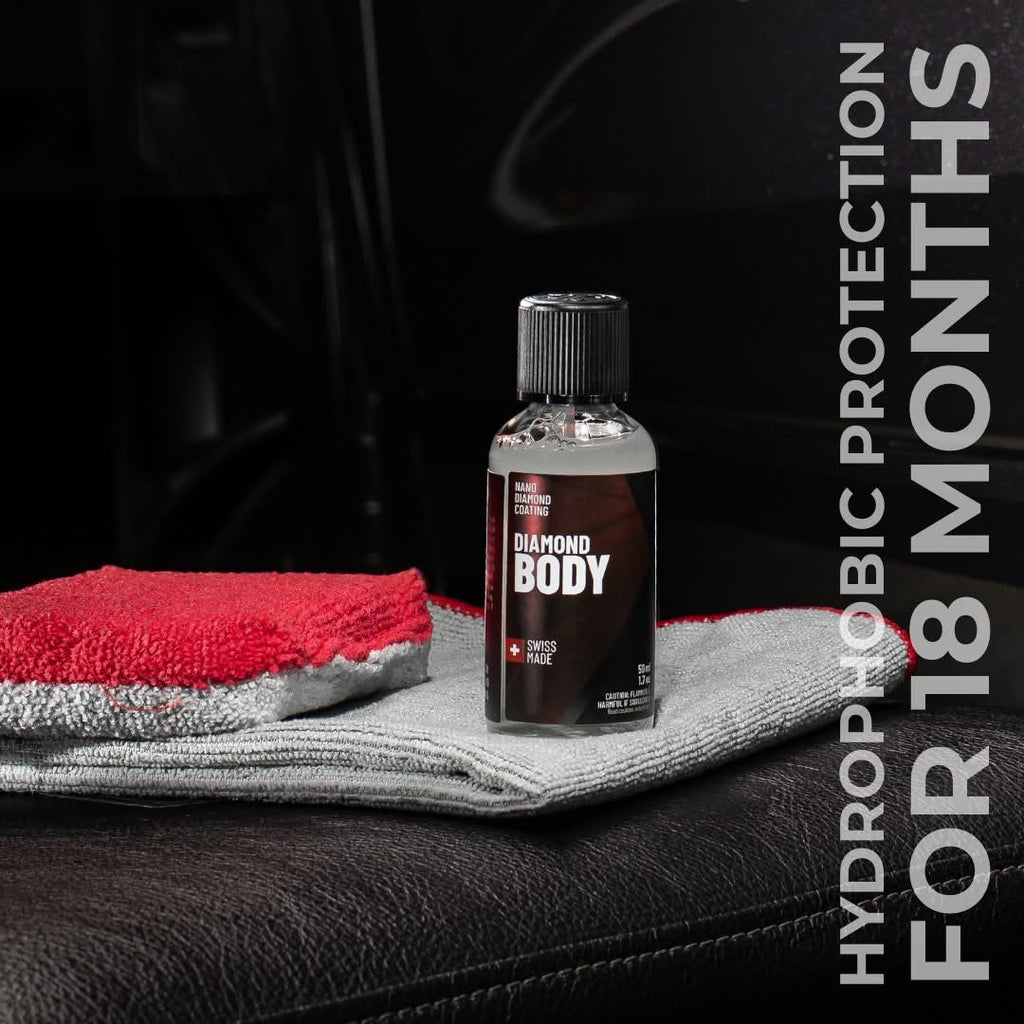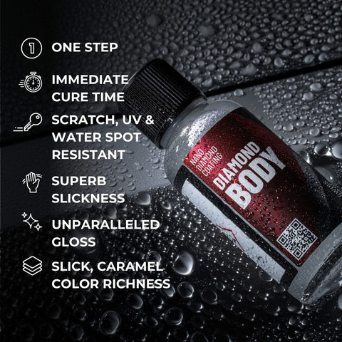 Derivado de la tecnología aeroespacial, Diamond Body es el primer recubrimiento de la industria con tiempo de curado cero. Su tecnología patentada de nanodiamantes le permite superar a los recubrimientos cerámicos, ya que ofrece más de sus excelentes características, eliminando el tiempo de curado necesario antes de su exposición a la intemperie y siendo mucho más fácil de usar. Este recubrimiento es la opción ideal si desea proteger su inversión y no requiere capacitación profesional ni experiencia previa en recubrimientos para obtener resultados impecables.